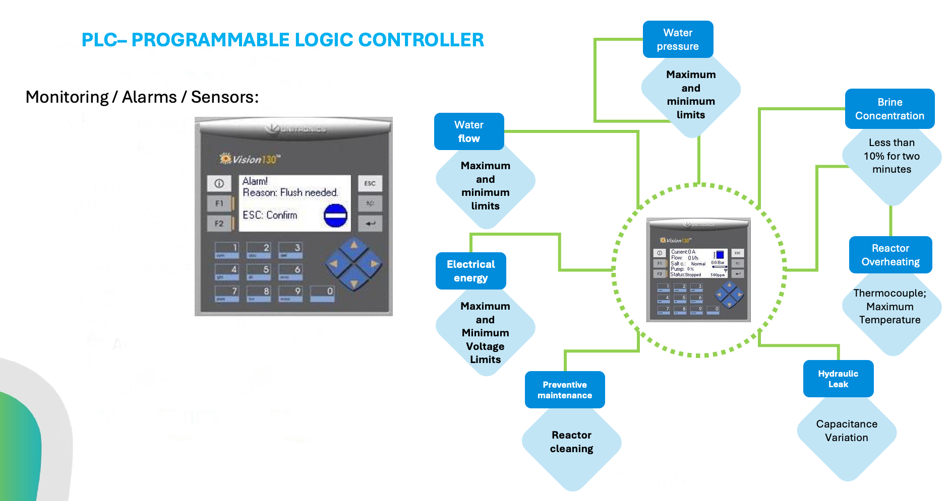 Monitoring points on Envirolyte USA generators and respective PLC alarms.