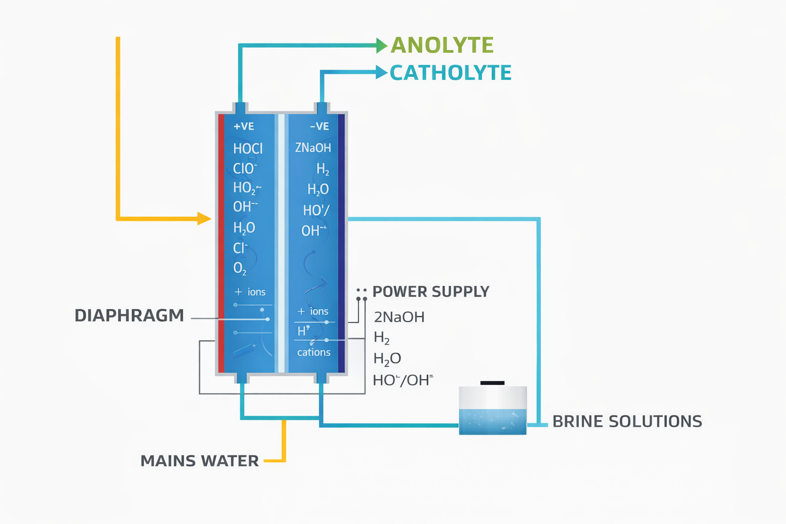 Our electrolysis cell technology allows the simultaneous production of Catholyte and Anolyte. Catholyte is an alkaline solution with degreasing power, while Anolyte is a non-toxic substitute that is up to 8 times more efficient than sodium hypochlorite. These substances can be synthesized in different pH ranges, enabling personalized treatment for each pool.